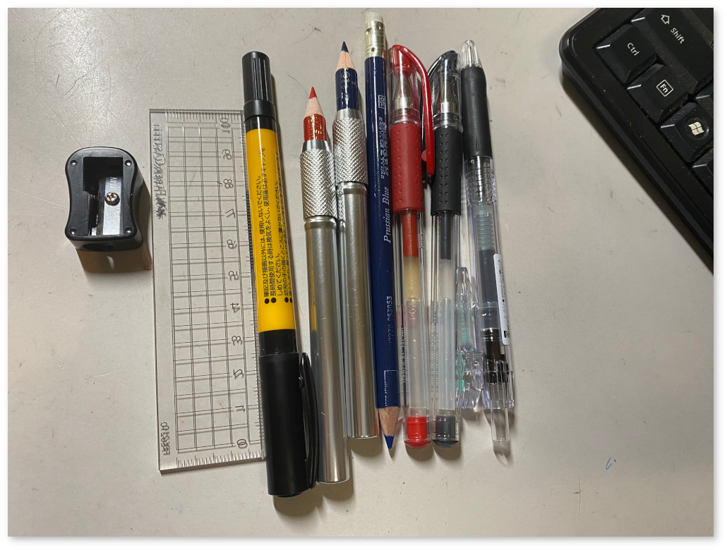 消しゴム付き青鉛筆(消しゴムで消せるタイプ)。これは仕事には向かない。仕事では消えてしまうものは過程が消えることになる。しかし、芯が硬いので、好み。