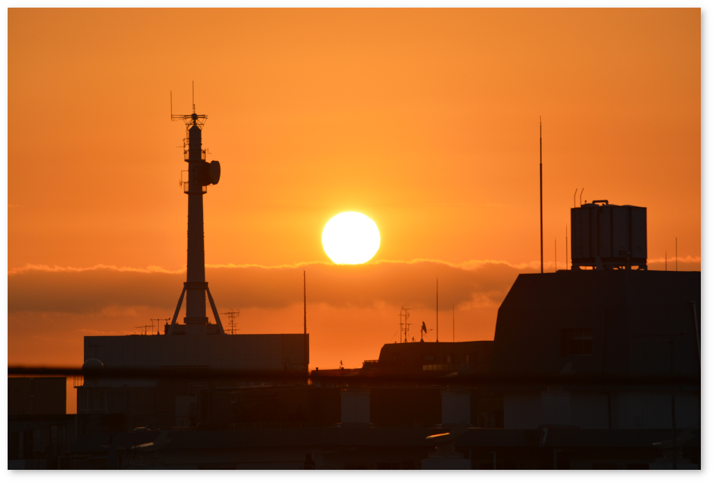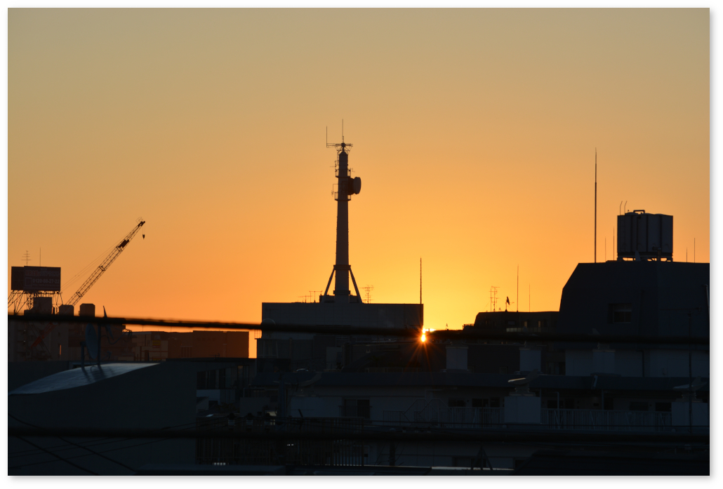 地平線がそのまま見えるわけではないので、建物の間から太陽が現れるのは日の出の時刻の少し後。