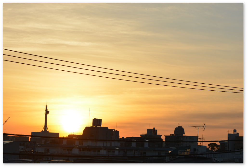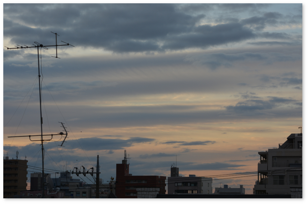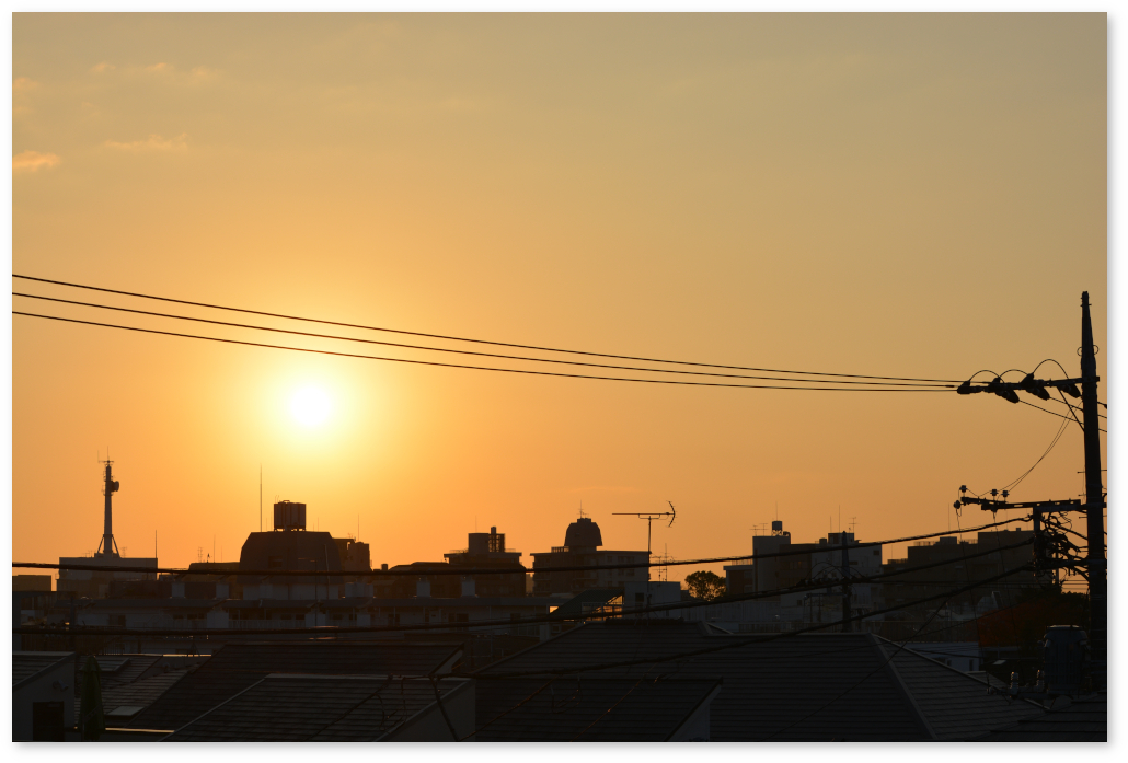 建物のシルエットに注目するのもおもしろいのと、上の電線が太く入ってしまわないように望遠レンズで撮っている。