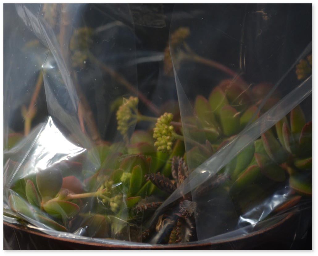 近年は強烈な寒さの冬は来ないので、外で越冬できるとは思うが、ビニールシートで覆うと多肉植物も楽かなと思う。