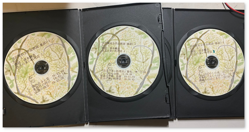 朗読して録音し、自分でCD化した宮沢賢治の『注文の多い料理店』が、年末の整理で出てきた。たしかmp3ファイルは宮沢賢治の朗読を収めたと思う。