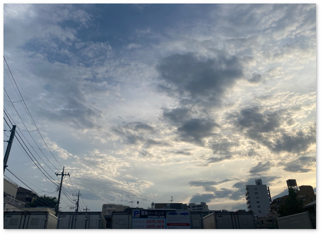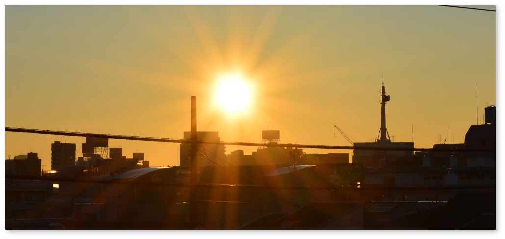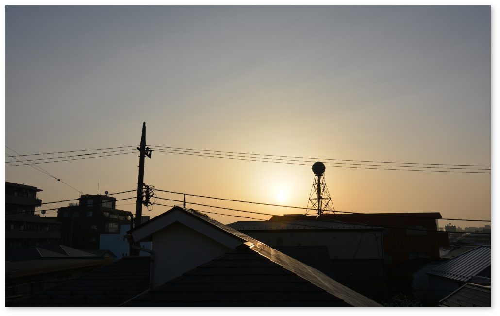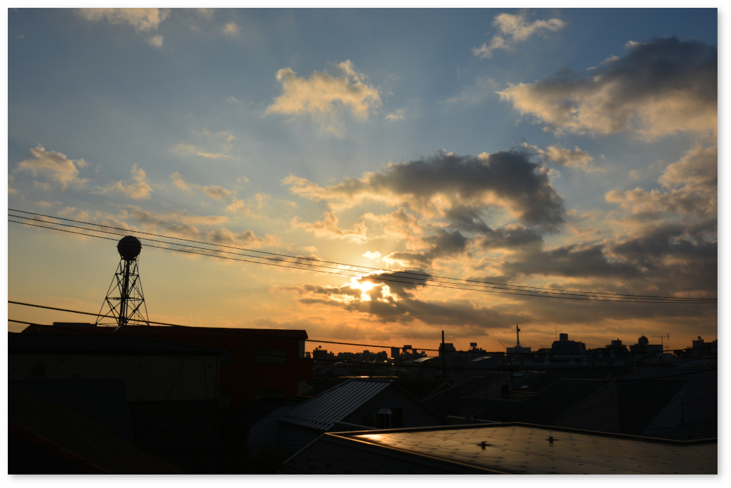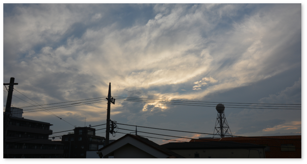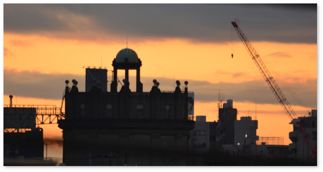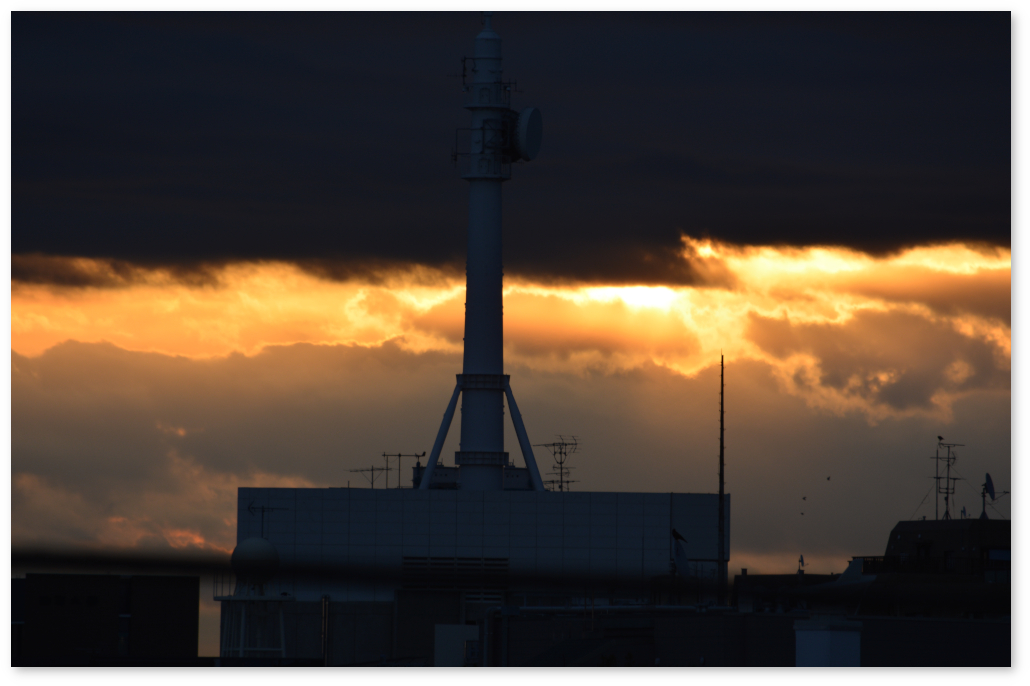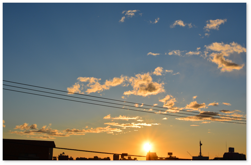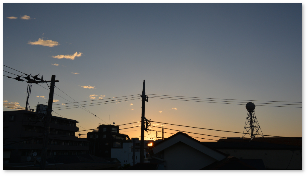 西の空は建物に遮られてあまり良く見えないのだが、隙間に夕焼けが見えた。