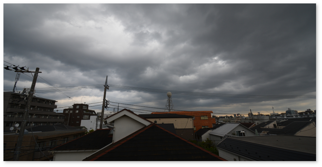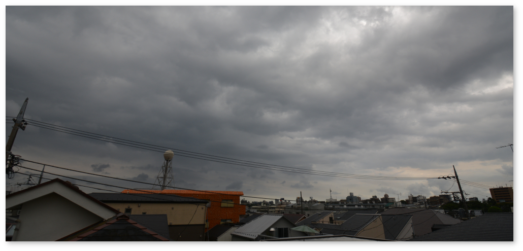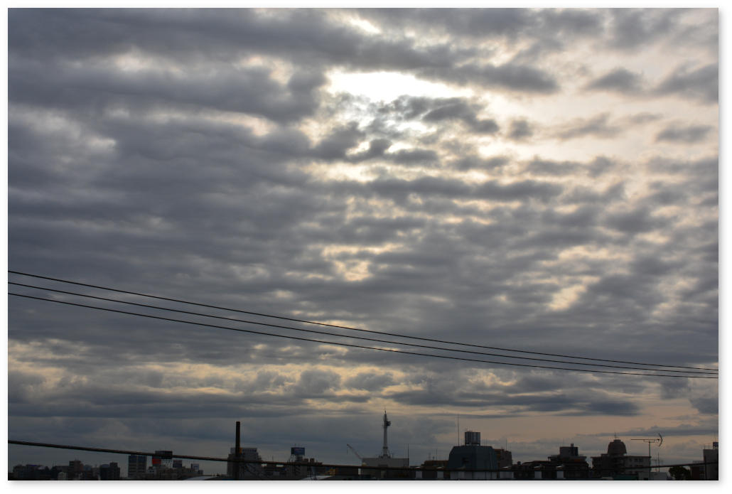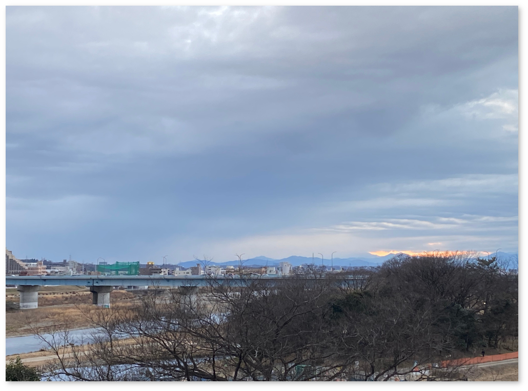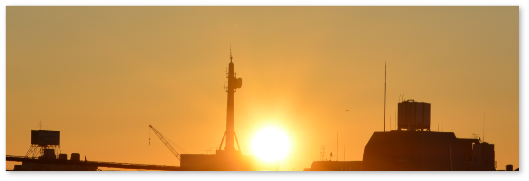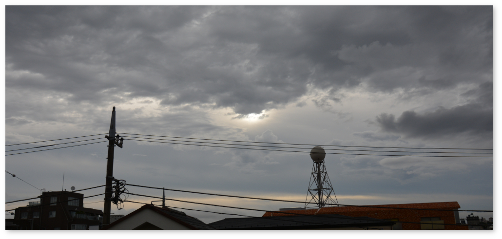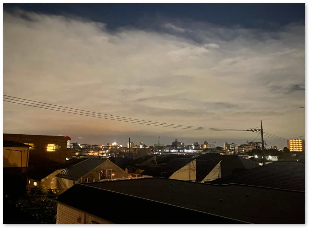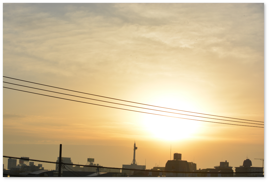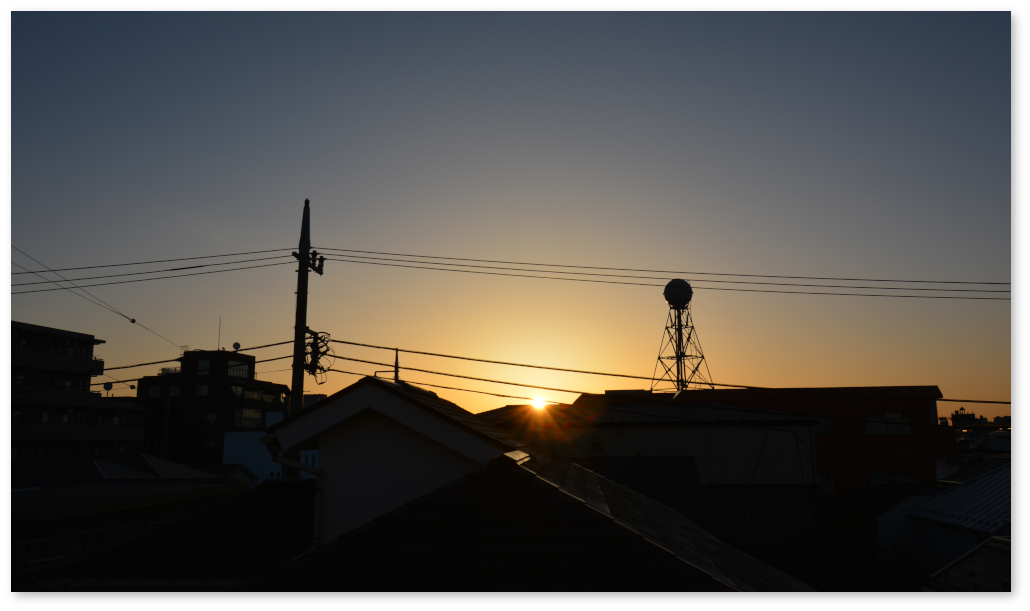 西の空は建物に遮られてあまり良く見えないのだが、隙間に夕焼けが見えた。