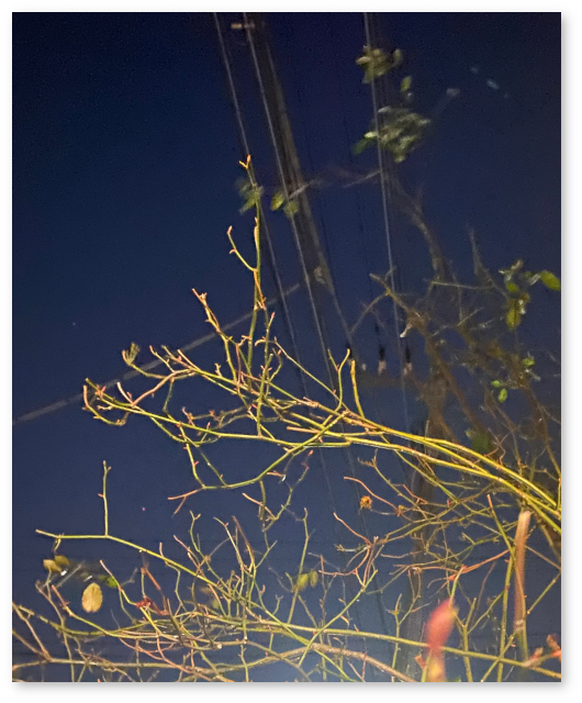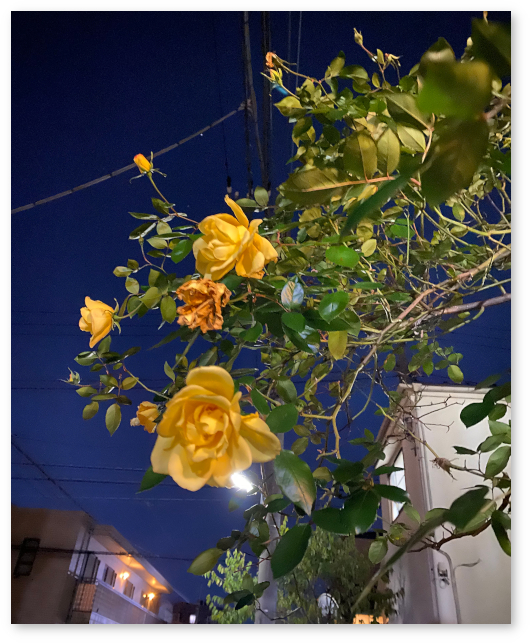 ウチの黄バラもふっくらと咲いている感じ。夜に撮る写真もおもしろいので、載せてみる。