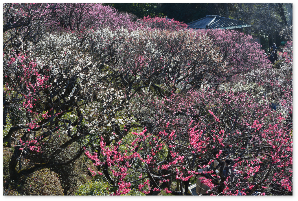 I saw Ikegami Plum Garden on TV and thought it was beautiful, so I decided to go there for a visit. It was a small plum garden built on a sloping terrain. Various plum trees with different colors of flowers, as well as drooping branches, were planted there, and it was bustling with visitors.
