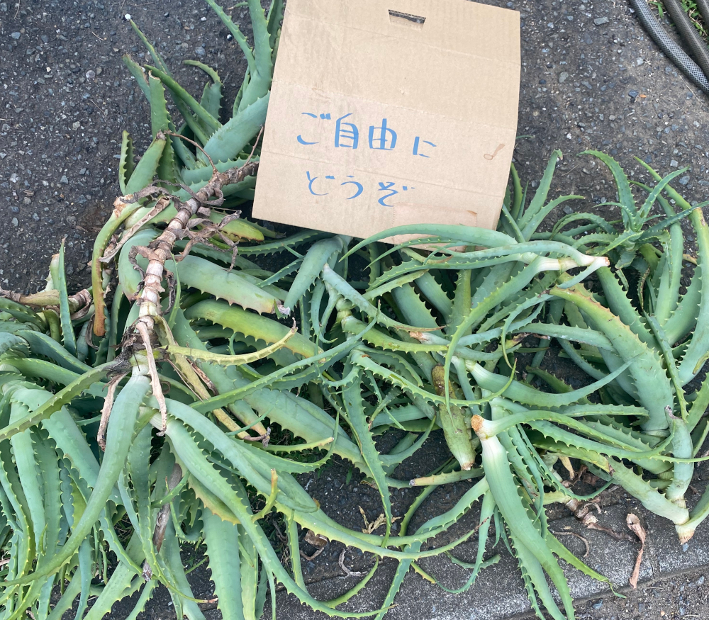 散歩していたら、道端にアロエの枝を並べている家があった。