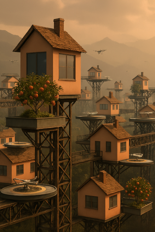 未来都市といっても、画像のようなものにはならないとは思うが、しっくりくるものはないかと思う。下の画像ではドローンを移動手段にしているが、そうなるとは思えない。